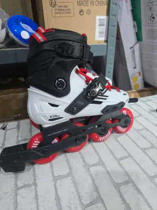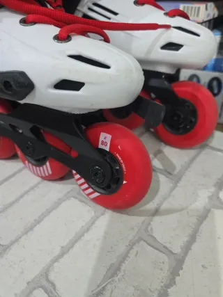 Patines en línea de color blanco y negro con detalles rojos. Puestos UNA VEZ - Talla 39. - Ruedas rojas de 80 mm. - Cierre de hebilla y velcro.