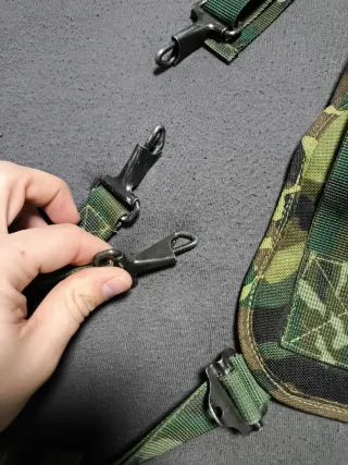 Correa de carga y panel personalizable para airsoft. Ideal para equipar tu equipo. - Correa con diseño de camuflaje. - Panel con sistema MOLLE para accesorios. - Enganches metálicos para sujeción.