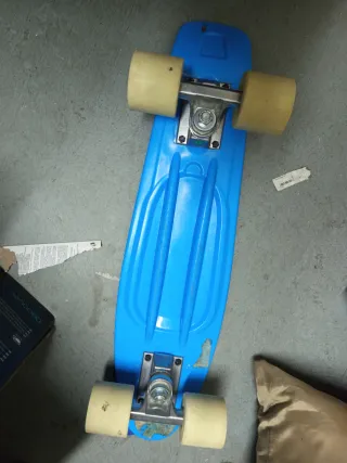 Monopatín de plástico azul con ruedas. - Cubierta con textura antideslizante. - Ruedas de color claro.