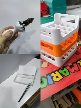 Pack de 4 artículos para pintura de miniaturas Warhammer. - Mango soporte con anclaje rotativo para apuntar las figuras comodamente. - paleta humeda - Cesto para pinturas a elegir entre, Vallejo, army painter y citadel. Otros se podrían customizar (se incluiría uno en el pack) - Cesto para figuras /almacenamiento (igual que el de pinturas pero plano para poder guardar las figuras que estés pintando se incluye uno de altura baja en el pack (opción de diferentes alturas) Se pueden vender por separado. Preguntar, se hace impresión bajo demanda solo se ofrece el servicio de impresión Cualquier duda no dudes en preguntar
