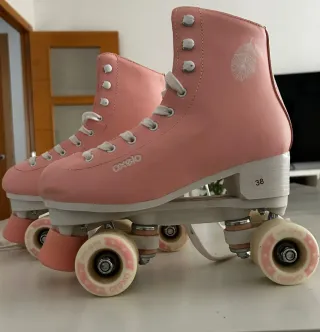 Patines clásicos de la marca Oxelo en color rosa y talla 38. Perfectos para iniciarse en el patinaje. - Diseño clásico. - Cordones blancos. - Detalle de pluma en el lateral.