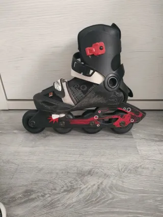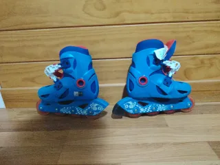 Se venden patines en línea Oxelo en color azul y rojo. Son ajustables para adaptarse al crecimiento. - Talla 30-32. - Cierre con velcro y hebilla. - Ruedas de poliuretano.