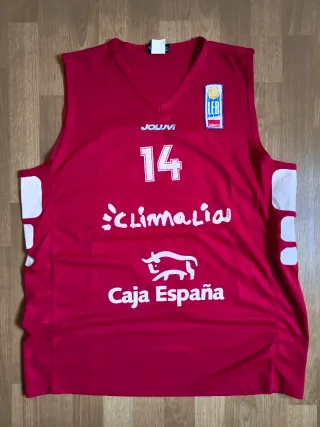 Camiseta de baloncesto del equipo León, utilizada en partido durante la temporada del ascenso a la ACB. - Color: Rojo - Número: 14 - Patrocinadores: Joluvi, Climalia, Caja España - Logo LEB Oro Adecco Baloncesto, basket, basquet, NBA, FIBA, Euroliga, euroleague, ACB, liga endesa, retro, vintage, matchworn, worn, match worn, game worn, match, Barcelona, Madrid, canotta, Maglia.