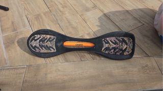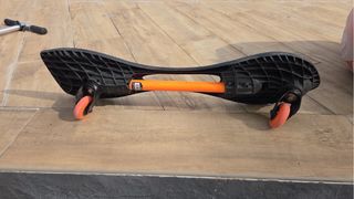 Patinete oscilante con diseño de dos plataformas y una barra de torsión naranja. - Dos ruedas delanteras y una trasera. - Plataformas negras con textura antideslizante. - Barra de torsión naranja.