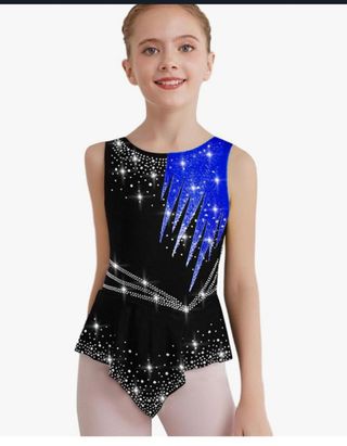 Maillot de gimnasia para niña con un diseño llamativo y detalles brillantes. - Diseño asimétrico con detalles en azul brillante. - Adornado con pedrería plateada. - Falda integrada con pedrería. Tengo 3 iguales, talla 5-6 años, nuevos en embalaje original. 12€ cada uno.