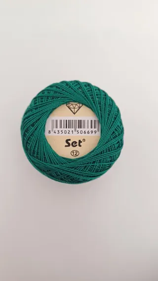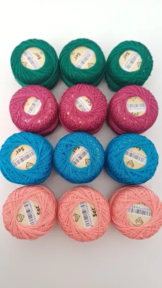 Conjunto de 12 ovillos de hilo de algodón para bordar. - Colores variados: verde, rosa, azul y coral. - Hilo de algodón 100%. - Ideal para labores de costura y bordado.