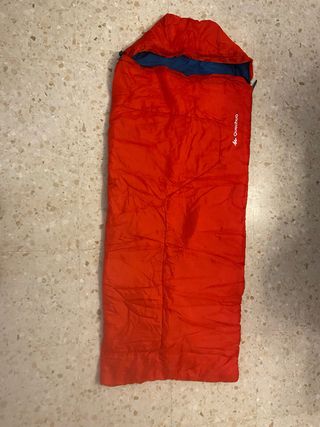 Saco de dormir Junior de color naranja, de la marca Quechua del Decathlon. Para niños de asta 140 cm, medidas del saco: 165 cm x 65 cm. - Diseño tipo momia. - Forro interior azul. - Marca Quechua