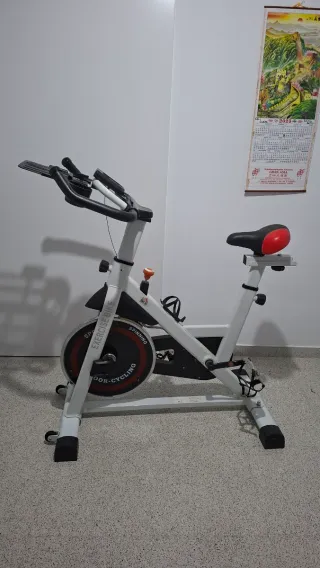 Bicicleta estática para entrenamiento de spinning en casa. Su diseño es moderno y funcional. Usada 4 veces, no tiene ni una hora entera de uso. - Estructura robusta de color blanco. - Asiento ajustable en altura y posición. - Manillar ergonómico. - Rueda de inercia para resistencia. - Pedales con agarre. - Soporte para botella de agua. ATENCION NO CAMBIOS