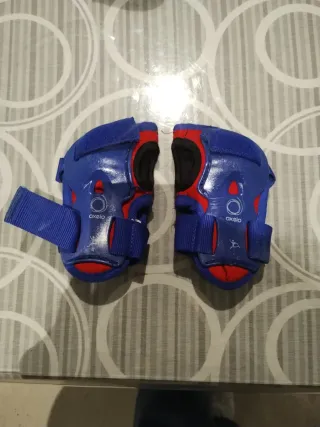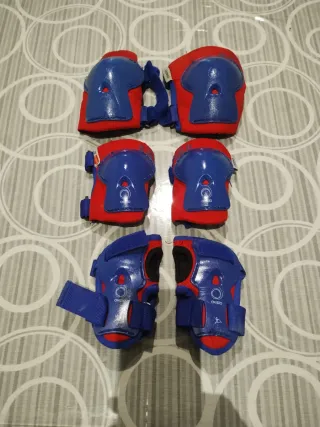 Set de protecciones para niños, ideal para patinar o montar en bicicleta. Incluye protecciones para rodillas, codos y manos.Estan algo arañados del uso pero ni rotos ni descosidos. - Diseño en color rojo y azul. - Cierres de velcro ajustables. - Marca: Oxelo.