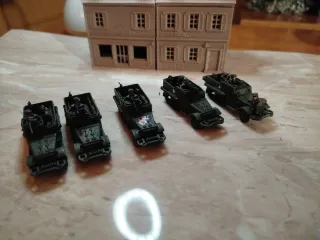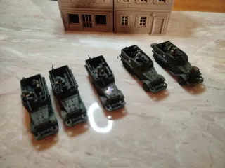 Pelotón de 4 vehículos SdKfz 251/9 de Flames of War. Uno de resina de battlefront original 3 creo que de Plástic soldier, no lo recuerdo.