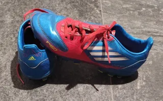 Botas de fútbol F-50 para niño con un diseño llamativo en azul y rojo. Talla 35 - Cierre con cordones. - Detalle de las tres rayas de Adidas.