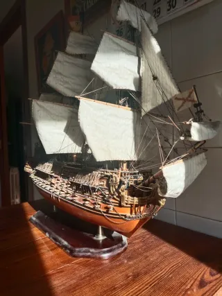 Réplica detallada del Galeón San Felipe, una pieza de colección para aficionados a la historia naval. Eslora, longitud 75 cm. Altura contando soporte 70cm. - Construcción en madera. - Mástiles y velas detallados. - Soporte de exhibición incluido.