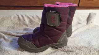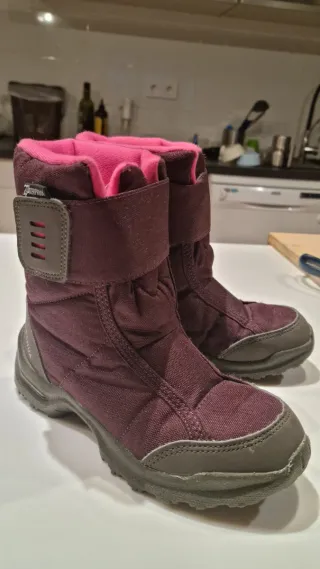 Botas de nieve para niña en talla 32. Perfectas para mantener los pies calientes y secos en el frío. - Color exterior morado. - Forro interior rosa. - Cierre de velcro. - Marca Quechua, del Decathlon.