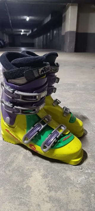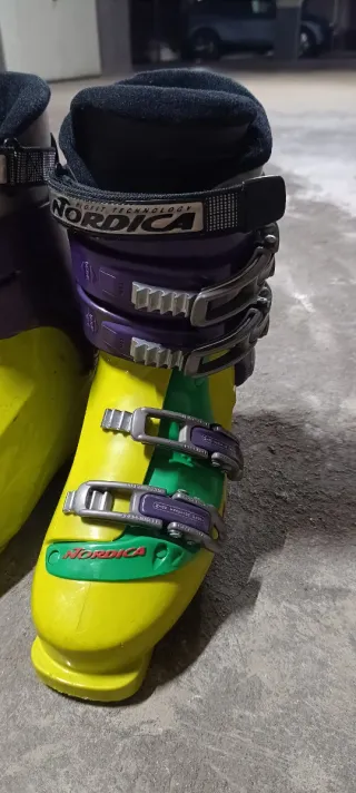 Botas de esquí alpino de la marca Nordica, con un diseño llamativo en amarillo, verde y morado. TALLA 38 - Cierre con hebillas. - Interior negro.