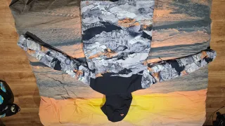 Chaqueta de snowboard Quiksilver con un diseño moderno y llamativo. - Talla M - Estampado abstracto en tonos grises, negros y naranjas. - Cremallera frontal naranja. - Capucha integrada. - Mangas largas.