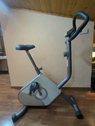 Bicicleta estática de color gris, ideal para entrenamientos en casa. - Diseño compacto. - Asiento ajustable. - Manillar ergonómico.