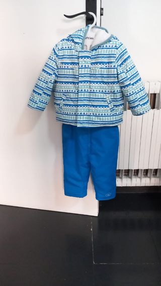 Conjunto de esquí para niños, compuesto por chaqueta y pantalón. - Chaqueta con estampado de motivos geométricos y estrellas en tonos azules y verdes. - Pantalón de color azul. - Capucha en la chaqueta.