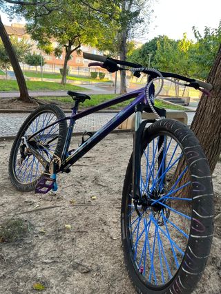 Bicicleta de montaña con un diseño llamativo y ruedas de color azul. - Cuadro de bicicleta. - Ruedas con radios azules. - Pedales de color.