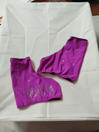 Cubre patines de color morado con el nombre María bordado en pedrería plateada. Tienen pequeños detalles de pedrería repartidos por la tela, sirven para patines en línea y de los normales queda ideal un regalo muy original. - Color: Morado - Nombre: María - Adorno: Pedrería