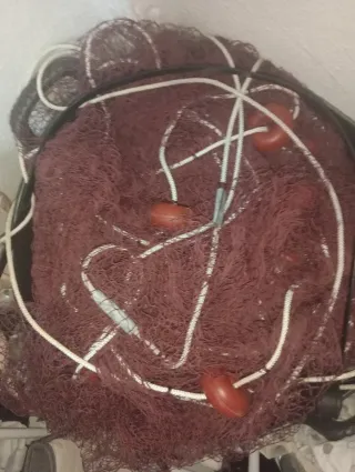 Red de pesca de color granate, lista para su uso. - Incluye varios flotadores de color naranja. - Cordaje blanco y negro. - Elemento metálico de unión.
