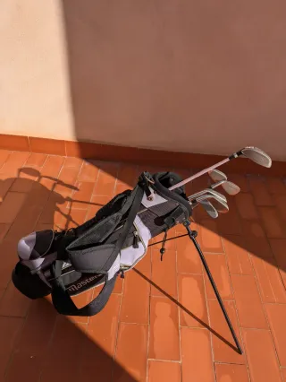 Conjunto de palos de golf para niña, ideal para iniciarse en este deporte. Incluye bolsa de transporte. - Bolsa de golf con soporte. - Palos de golf con varillas flexibles. Incluye bolsa trípode, put, sand, 8, 5 y madera.