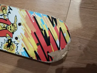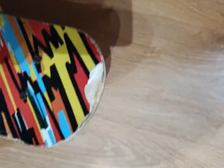 Monopatín con un diseño llamativo y lleno de color, perfecto para los más pequeños. - Base con estampado de líneas y formas geométricas. - Ruedas y ejes visibles. Está un poco desgastado, es de tamaño pequeño