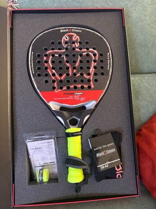 Pala de pádel Black Crown Piton Epic con un diseño moderno y llamativo. Tiene un solo uso de prueba - Pala de pádel. - Marca: Black Crown. - Modelo: Piton Epic. - Incluye funda. - Empuñadura de color verde neón.