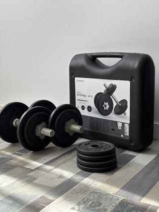Kit de mancuernas de 20 kg de Decathlon, ideal para entrenar en casa. Incluye todo lo necesario para ajustar el peso. Precio original: €50,- - Dos barras cortas. - Cuatro discos de 2 kg. - Cuatro discos de 3 kg. - Dos discos de 5 kg. - Cierre de seguridad para las barras.