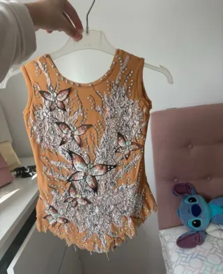Maillot de gimnasia rítmica con un diseño de mariposas y detalles brillantes. Ideal para competiciones o entrenamientos. Vendo maillot de gimnasia rítmica con cristales colocados a mano. Por el paso del tiempo puede faltar algún cristal, pero en general está en muy buenas condiciones, bien cuidado y listo para seguir brillando en el tapiz ✨ 📏 Talla / Medidas: No indico edad porque este tipo de maillots se adapta mucho al cuerpo. Si estás interesad@, te paso las medidas exactas sin problema para que compruebes si encaja bien. 💰 Precio: El precio es orientativo y se puede hablar según interés. 📩 Interesad@s: Escríbeme sin compro