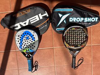 Raquetas de pádel Head y Drop Shot con sus fundas.