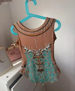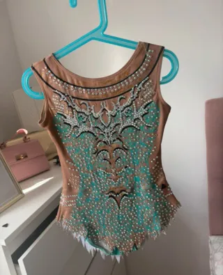 Maillot de gimnasia rítmica con un diseño llamativo y lleno de cristales - Color base: tono piel/marrón claro. - Detalles: pedrería plateada y turquesa. - Diseño: con escote redondo y sin mangas. - Adornos: bordes con pedrería y detalles negros. Por el paso del tiempo puede faltar algún cristal, pero en general está en muy buenas condiciones, bien cuidado y listo para seguir brillando en el tapiz ✨ 📏 Talla / Medidas: No indico edad porque este tipo de maillots se adapta mucho al cuerpo. Si estás interesad@, te paso las medidas exactas sin problema.