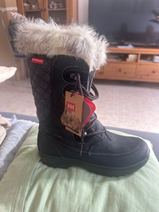 Botas para nieve sin usar con las siguienes caracteristicas: Forro térmico: Con aislamiento Material de la plantilla: Pelliza sintética Material interior: pelo sintético, Material textil Material exterior: Imitación de cuero , Material sintético , Cuero natural nobuk Material de la suela: Material sintético Tecnologías: Helly Grip Helly Wear HH® Max-Grip Ortholite PrimaLoft® Waterproof HH® Surround-Grip