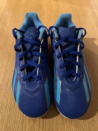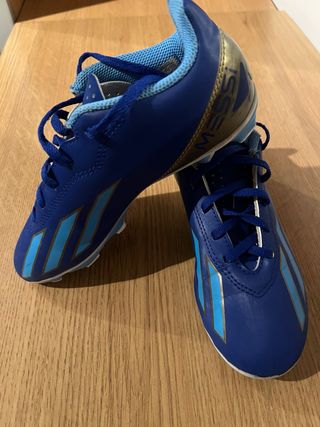 Botas de fútbol para césped artificial o natural. Usadas 10 dias , estan en perfectas condiciones! - Talla 34 - Color azul con detalles en dorado y celeste. - Diseño inspirado en Messi. - Cierre con cordones. De regalo las protecciones.