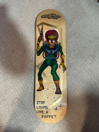 Tabla de skate personalizada con diseño de Mars Attacks pintada a mano con aerografía con su etiqueta de certificación - Ilustración de alienígena con traje espacial y arma. - Texto Stop living like a puppet en la parte inferior. - Firma del artista en la parte trasera. skate,santa cruz, powell peralta , vision, word idustries, hstreet,variflex, sancheski , nai, traker, blockhead