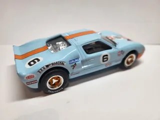 Coche de slot Scalextric Ford GT40 con la icónica decoración Gulf. Nuevo a estrenar. - Réplica detallada del Ford GT40. - Decoración Gulf azul y naranja. - Número de dorsal 6.