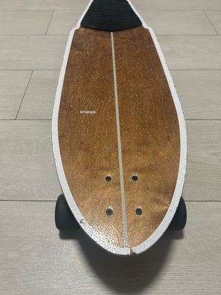 Patinete con un diseño inspirado en las tablas de surf, ideal para deslizarse. - Tabla de madera con acabado brillante. - Parte superior con grip negro texturizado. - Borde blanco decorativo.