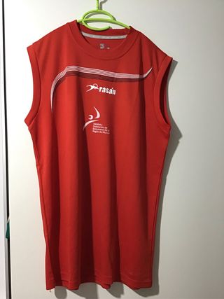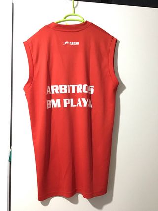 Camiseta sin mangas de color rojo, ideal para árbitros de balonmano playa. Presenta un diseño deportivo con detalles en blanco y líneas finas. - Marca: Rasán - Logo de la Federación de Balonmano de la Región de Murcia