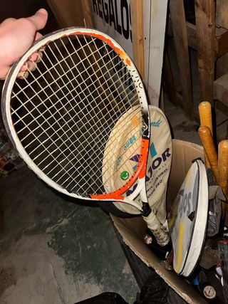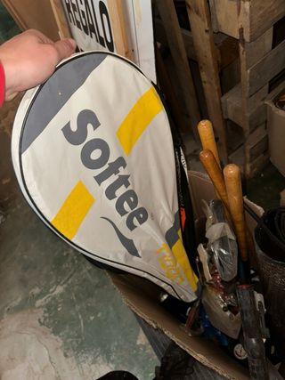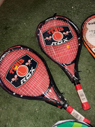 Conjunto de 7 raquetas de tenis de diferentes marcas y 2 de bádminton - Raqueta Softee B500 new. - Raqueta Wilson. - Raqueta Yamamei AT-33M. - Raqueta Softee con diseño let's play tennis. - Raqueta con funda roja y diseño similar a la Softee.