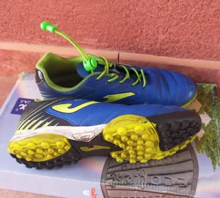 Botas de fútbol Joma para niño, con un diseño llamativo en azul y detalles en verde. - Cierre con cordones elásticos y tanca. - Suela apta para césped artificial o moqueta. - Detalle de logo en los laterales. - Número 36 En perfecto estado, solo marcas normales del uso.
