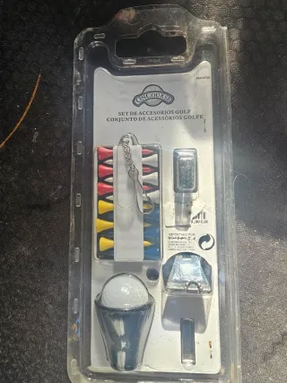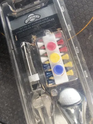 Kit de accesorios de golf de la marca OnCourse. - Incluye tees de golf de varios colores. - Marcador de bola. - Divot tool. - Soporte para bola de golf.