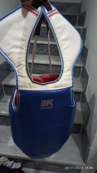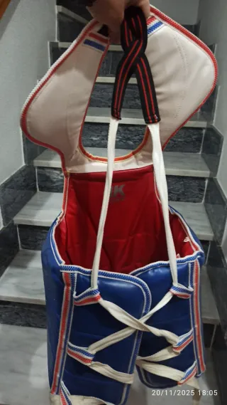 Peto de taekwondo homologado talla 5, casco y protección de espinillas. - Color azul con detalles en rojo y blanco. - Cierre con cordones cruzados. Solo tiene unos pequeños picados en uno de los lados, que se aprecia en la foto, pero solo es estético.