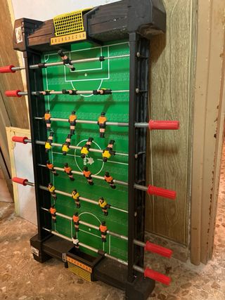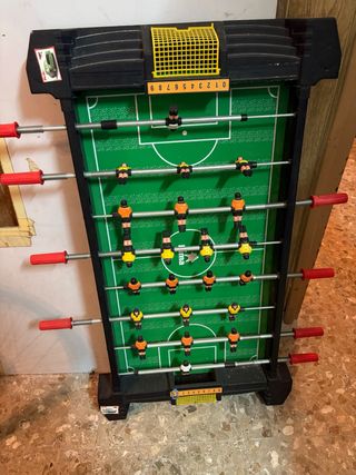Futbolín de mesa para niños, ideal para horas de diversión. - Campo de juego verde con líneas blancas. - Jugadores de plástico en colores naranja y amarillo. - Barras metálicas con mangos rojos. - Marcador numérico en la parte superior. 1m de largo y 50cm de ancho y con patas