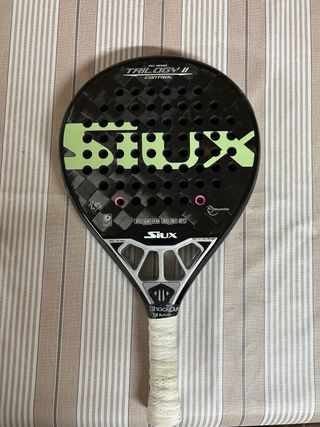 Pala de pádel Stux Trilogy II en color negro y verde lima. - Diseño con logo Stux en verde lima. - Marco con detalles plateados. - Grip blanco.