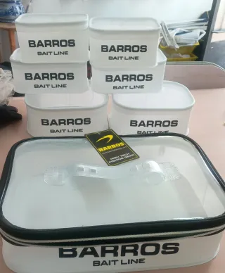 Lote de 7 bandejas organizadoras de cebo de la marca Barros. - Diseño transparente con borde negro. - Asa central para facilitar el transporte. - Compartimentos interiores para organizar el cebo.
