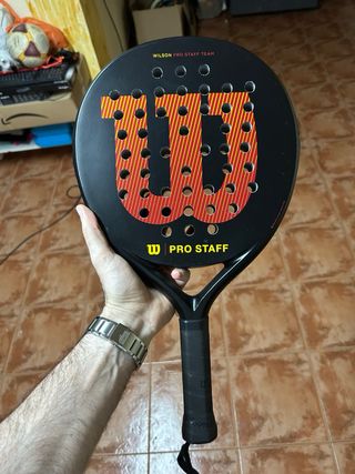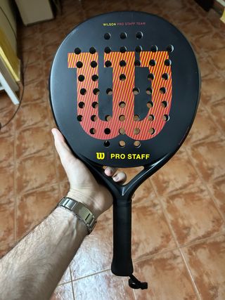 Pala de pádel Wilson Pro Staff. - Pala de pádel negra con detalles en rojo y amarillo. - Diseño con el logo 'W' de Wilson. - Modelo Pro Staff Team.