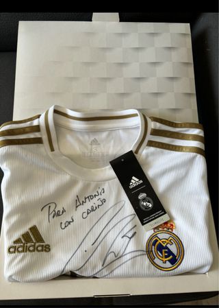 Camiseta oficial del Real Madrid con firma. - Diseño en color blanco y detalles dorados. - Talla S.