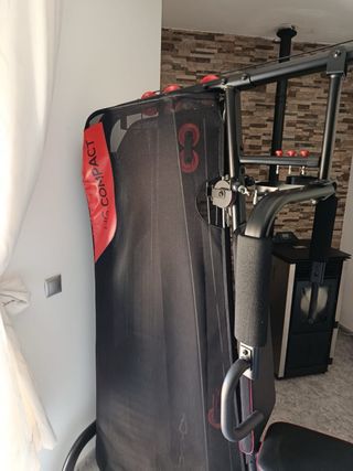 Máquina multifunción para entrenar en casa. Ideal para trabajar diferentes grupos musculares. - Estructura robusta de color negro y rojo. - Asiento y respaldo acolchados. - Barras de pesas integradas. -Hasta 60 kg de levantamiento de peso.