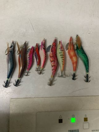 Lote de señuelos para la pesca de calamar, sepia y pulpo. Son ideales para atraer a estas presas marinas. - Diseño realista imitando a pequeños peces. - Varios colores y acabados disponibles. - Equipados con anzuelos dobles para una mejor sujeción.