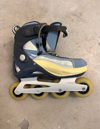 Patines en línea con un diseño moderno en tonos azules y grises. - Ruedas de color amarillo. - Cierre de velcro y cordones. - Botín interior acolchado.