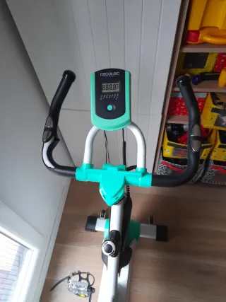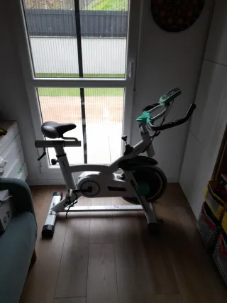 Bicicleta estática de spinning en color blanco con detalles en verde. Ideal para entrenamientos en casa.(tiene un pequeño desperfecto en la empuñadura izq,como se muestra en la última foto) - Diseño moderno y robusto. - Asiento ajustable. - Manillar ergonómico.